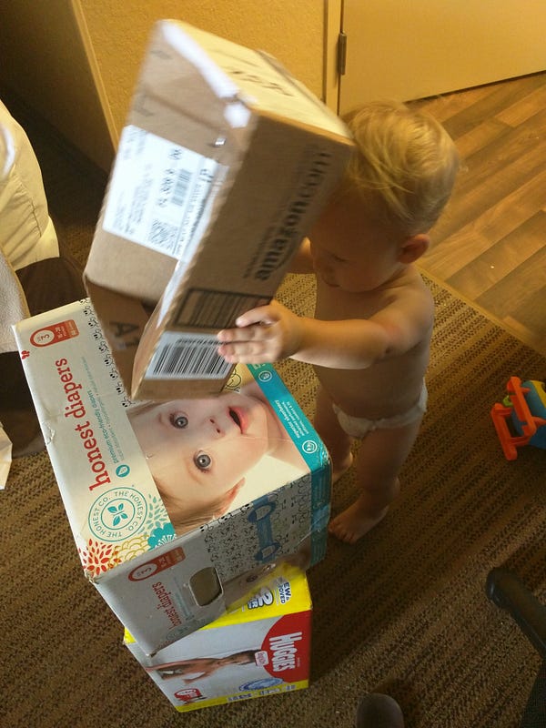 More than anything else, he saw me and his Dad hold on to our family and count on each other for support to get through this time. It didn’t take a brain surgeon to feel how unhappy we were with our living situation. The only indication LPD made that he needed more space or privacy was when he claimed an empty diapers box as the place he would put “his things.” One evening, he simply packed all of his toys, shoes, anything loose into this box and it became his place. Sometimes he would turn it over and just have a toddler sized chair in which to sit. We got two more boxes eventually and they became building blocks. You never saw a happier kid than LPD with his boxes. We packed up the whole room and moved to a nicer hotel for the second (hopefully last) month of temporary living and he made sure his boxes safely made the trip.
